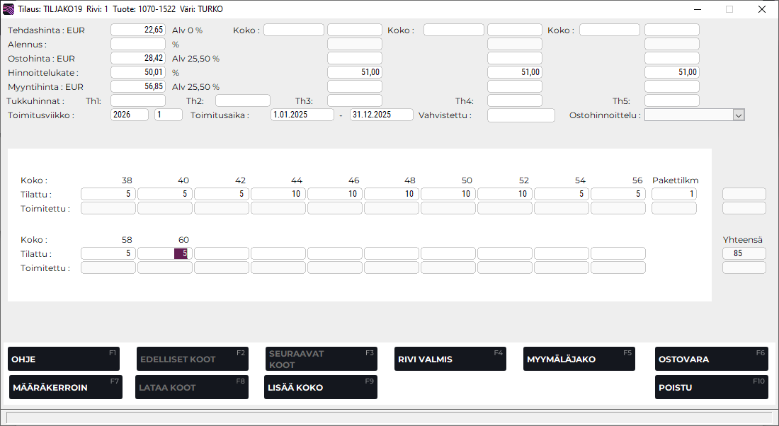 F9 Lisää koko | Avaa erillisen Lisää koko-ruudun, jossa voit lisätä uuden koon ko. tilauksen kokolajitelmaan . Koko voidaan lisätä ennen määrien syöttämistä kursorin ollessa tilattu sarakkeessa. Koko ei tallennu Kokolajitelma-tiedostoon. Muut funktionäppäimet liittyvät Myymäläjakoon ja Ostobudjetointiin, jotka ovat ohjelman maksullisia lisäpiirteitä ja joista on erillinen ohje. |