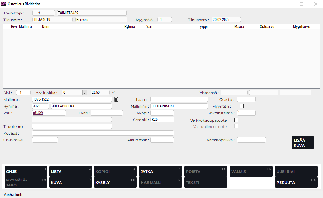 Syötä mallinumero ja paina Enter. Mikäli kyseessä on tuoterekisteristä jo ennestään löytyvä tuote, voit myös hakea sen listalta painamalla F2 Lista. Vanhan mallin ollessa kyseessä ohjelma tuo tuotteen tiedot automaattisesti ruudulle ja siirtää kursorin tilauskappaleisiin.