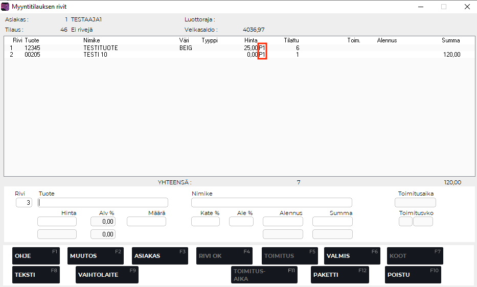 Alla olevassa esimerkissä on aloitettu paketin tekeminen F12 Paketti-painikkeella, jonka jälkeen pakettiin on syötetty rivit 1 ja 2 normaalihinnoin. Rivin 2 hyväksymisen jälkeen paketti on päätetty painamalla F12 Paketti, jolloin avautuu Pakettihinnoittelu-ruutu, jossa annetaan koko pakettia koskeva hinta.