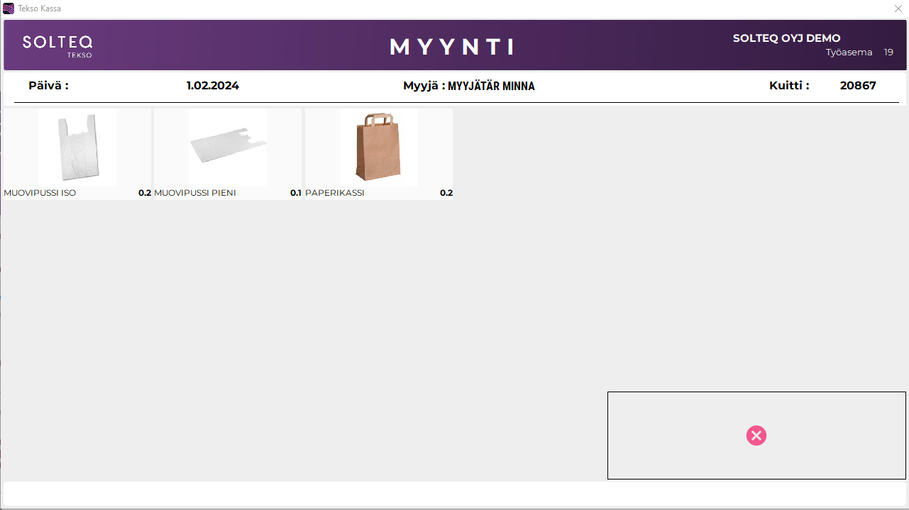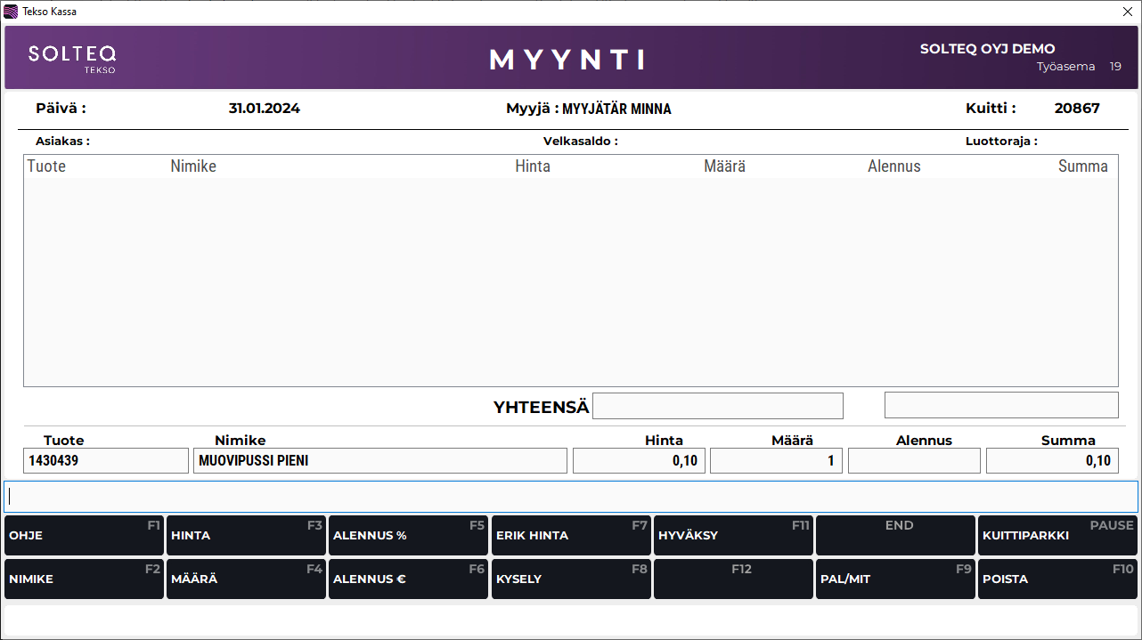 Kun valitset tuotteen, se siirtyy myyntinäkymän syöteriville, jossa voit tarvittaessa muuttaa vielä esimerkiksi lukumäärää.
