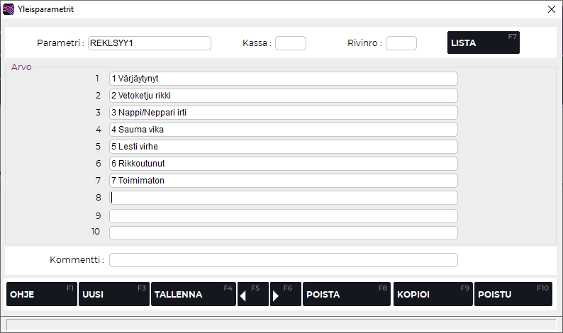 Syötä parametrin arvoksi syykoodit, joilla reklamaatiot halutaan luokitella: kunkin rivin alkuun syykoodi (enintään kaksi merkkiä) ja sen jälkeen kyseistä syykoodia vastaava selite (esim. 1 Värivirheellinen). Vähintään yksi syykoodi on oltava olemassa, jotta reklamaatioita voidaan kirjata.