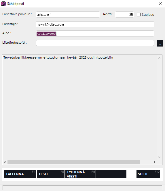 Sähköpostin toimittamiseen tarvittavat perusmääritykset tehdään yleisparametreissa, joten ennen toiminnon käyttöönottoa ota yhteyttä Solteqin asiakastukeen.