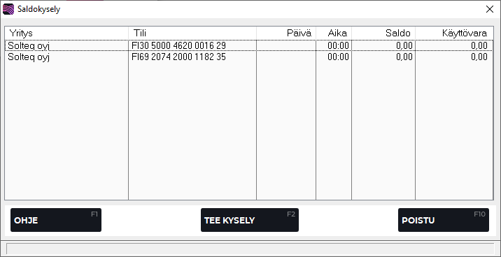 F2 Tee kysely-toiminnolla ohjelma tuo vain käsiteltävän pankin saldon.