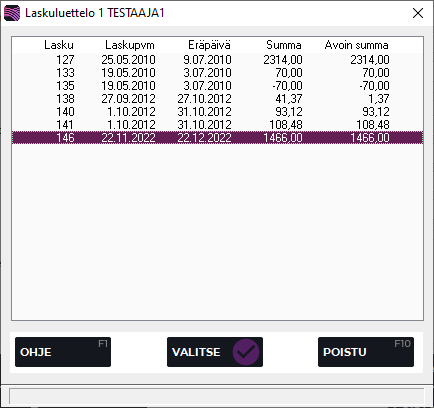 Paina F4 Laskulista. Laskuluettelo-ruutu avautuu. Valitse lasku, jolle suoritus kohdistetaan ja paina Valitse ✓.