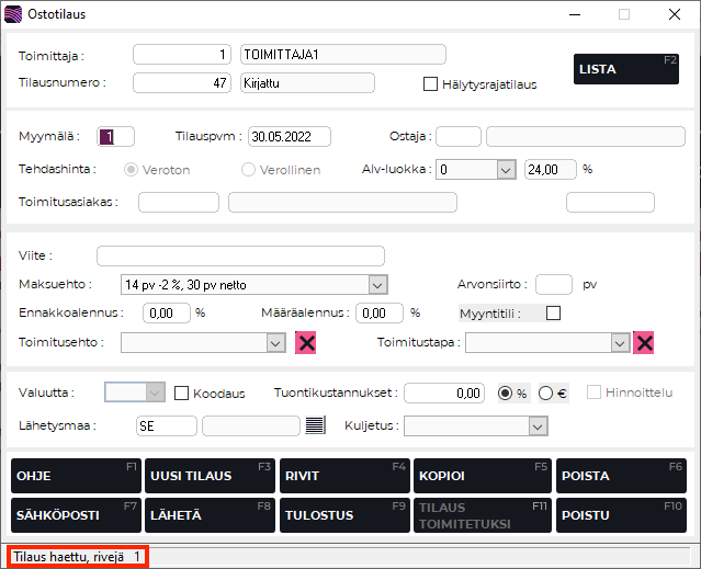 5. Mikäli valitsit F4 Rivit-painikkeen, voit suoraan lisätä tilaukselle uuden rivin/rivejä. Käytössäsi on myös valikoima funktionäppäimiä.