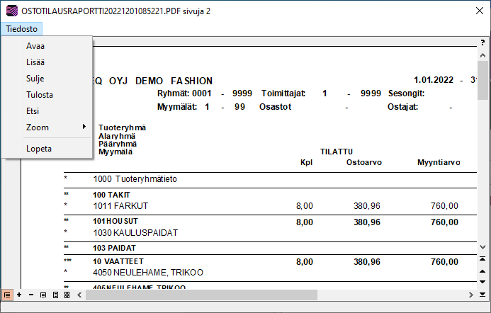 • Kun valitset raportin esikatseluun Tekso -tulostustavalla, saat ylävalikon Tiedosto –toiminnon kautta esiin aputoimintoja.