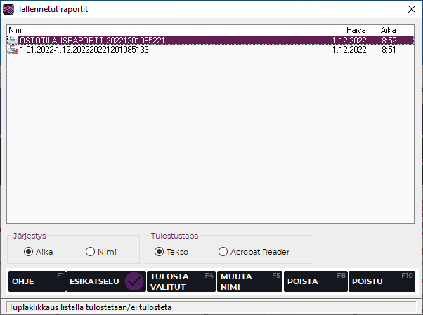 Tulosta valitsemasi raportit painamalla F4 Tulosta valitut.