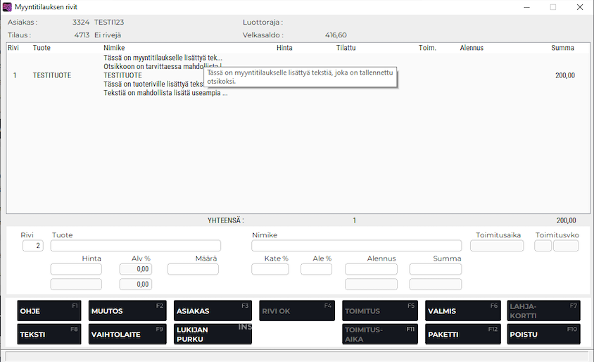 Voit myös halutessasi tallentaa tekstin myyntitilauksen alkuun otsikoksi painamalla F6 Tallenna otsikoksi.