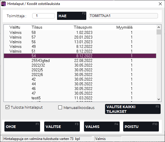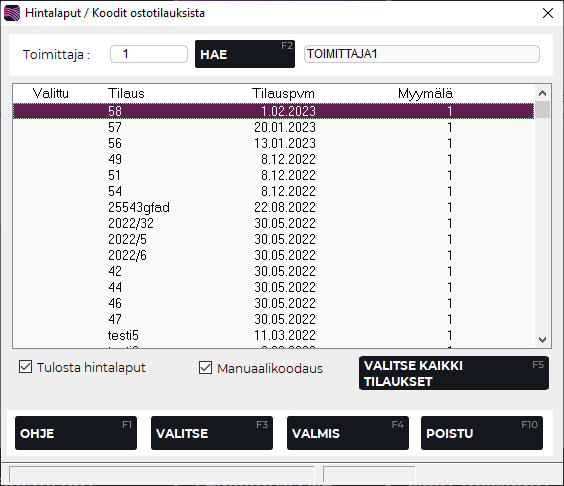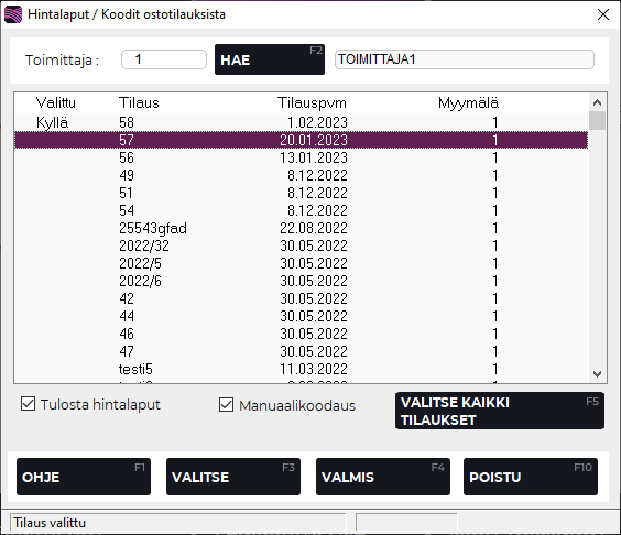 Valitse tilaus/tilaukset, joista haluat hintalaput jo ennen varastoontuloa painamalla F3 Valitse tai F5 Valitse kaikki tilaukset.