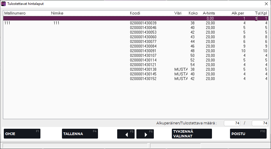 Paina F4 Jatka tulostaaksesi valintojen mukaiset hintalaput.
