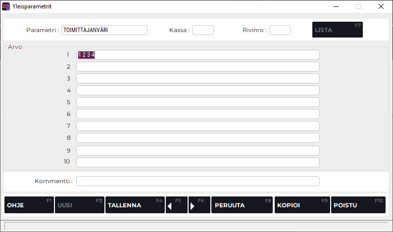 Toiminto tulee käyttöön, kun lisäät TOIMITTAJANVÄRI-parametrin yleisparametreihin. Mikäli parametria ei ole määritelty, toimittajakohtainen väriseuranta on käytössä kaikilla toimittajilla.