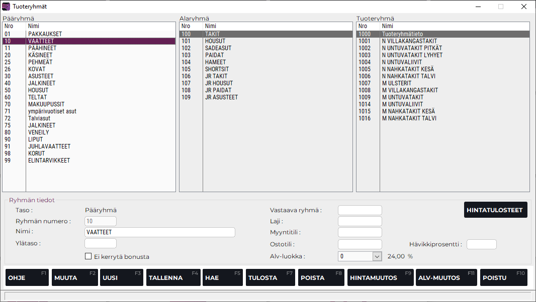 Alla olevassa esimerkissä näkyy 3-tasoinen ryhmittely. Ryhmätasojen nimet (Pääryhmä, Alaryhmä, Tuoteryhmä) voidaan tarvittaessa nimetä muuksikin Solteqin toimesta tehtävällä parametroinnilla.