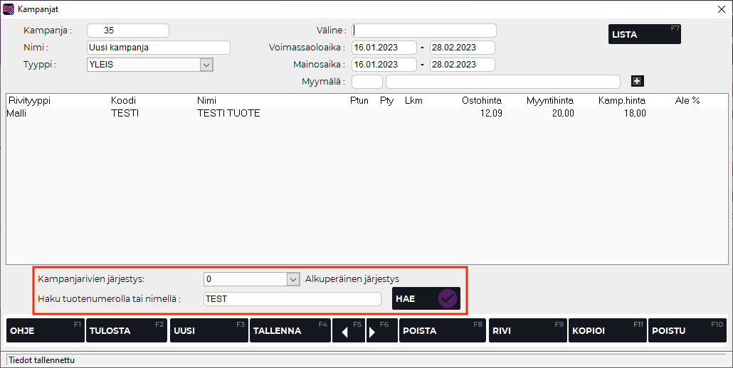 Kampanjarivien järjestyksen valinta ja haku tuotenumerolla tai nimellä -toiminnot löytyvät kampanjan perustietoruudun alaosasta.