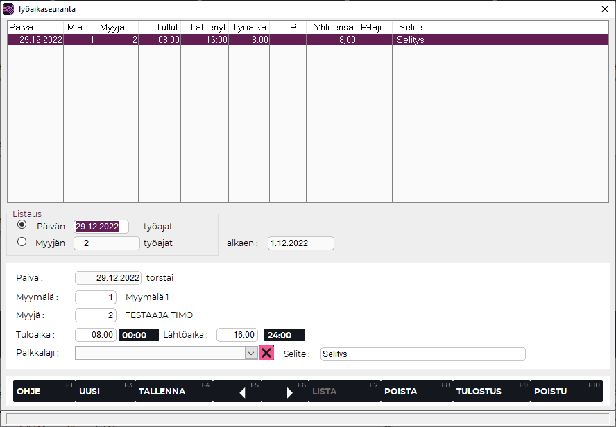 Oletuksena ruudulla näkyvät tietyn päivän työaikaleimaukset. Listaus-valinnalla voit valita, käsitelläänkö annetun päivän vai tietyn myyjän työaikoja. Voit selata F5 ja F6 -painikkeilla ruudun alaosassa näkyviä aikoja.