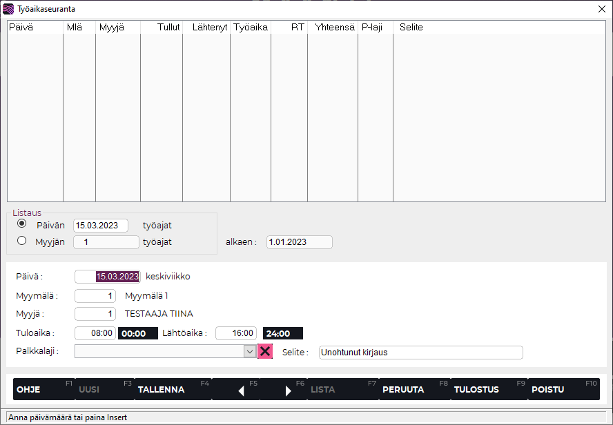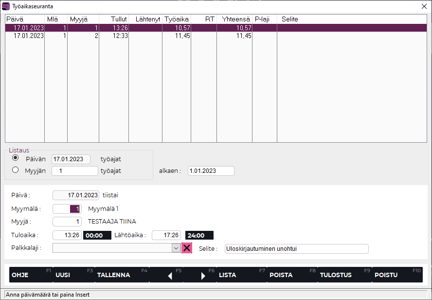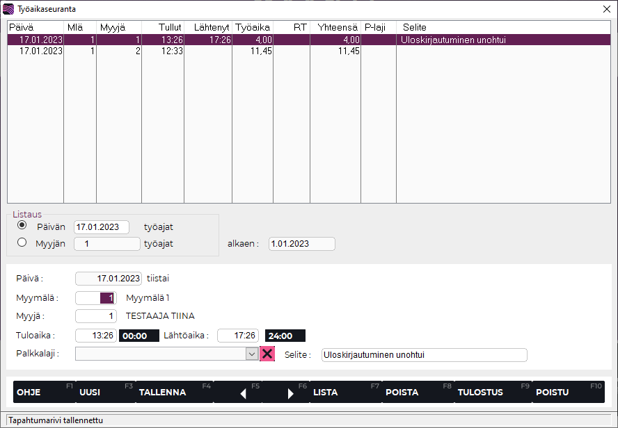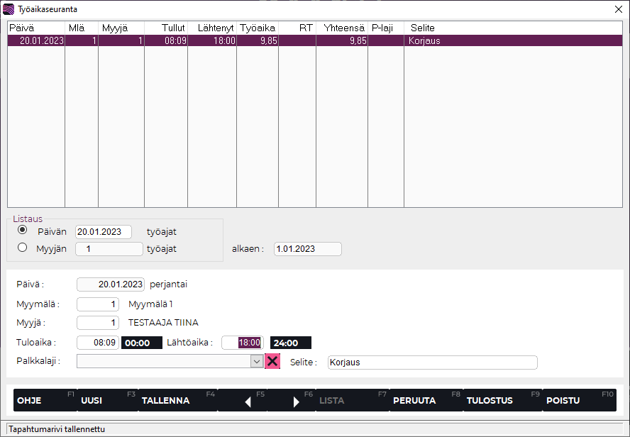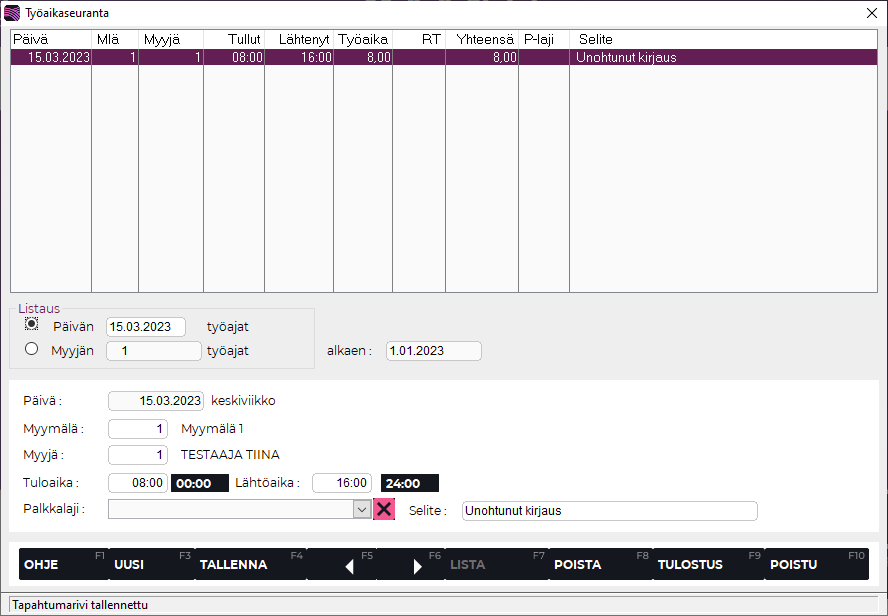 Tallenna painamalla F4 Tallenna. Työaikakirjaus on nyt päivitetty.