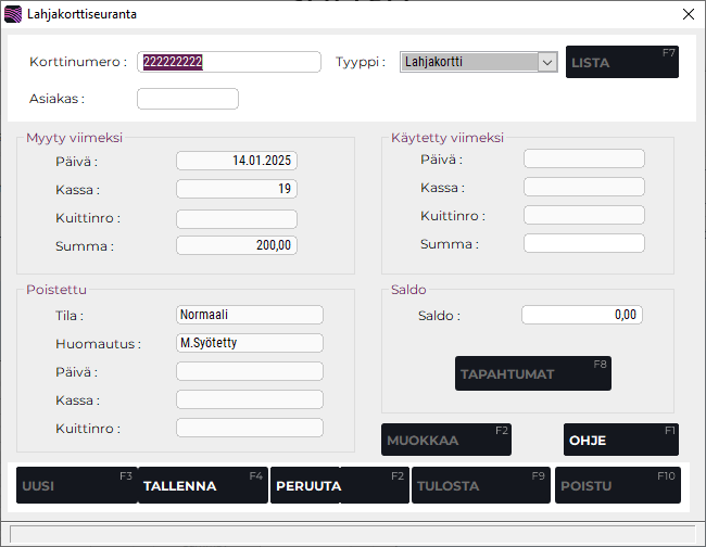 Kun tämä Tekson lisäpiirre on otettu käyttöön, Lahjakorttiseuranta-ruudulla on näkyvissä F3 Uusi -painike.