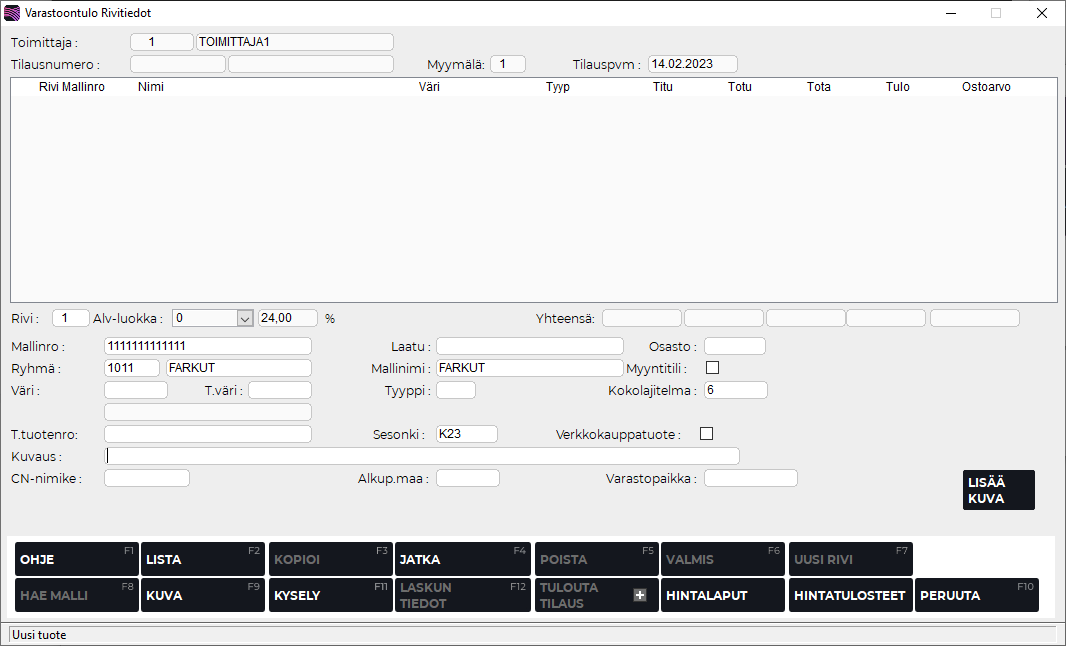 Voit perustaa varastoontulossa mallin, jota ei ennestään ole rekisterissä. Syötä tällöin Mallinro-kenttään haluttu tuotenumero ja muihin kenttiin tarvittavat tiedot.