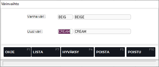 Kun painat Hinnoittelu-ruudulla F4 Muuta väri, saat esiin Värinvaihto-ruudun, jossa voit muuttaa tuotteen värin. Tällöin vanha väri poistuu järjestelmästä kokonaan ja kaikki sillä oleva muutospäivää aiempi myynti ja varastohistoria siirtyy uudelle värille. Uusi väri voi olla
