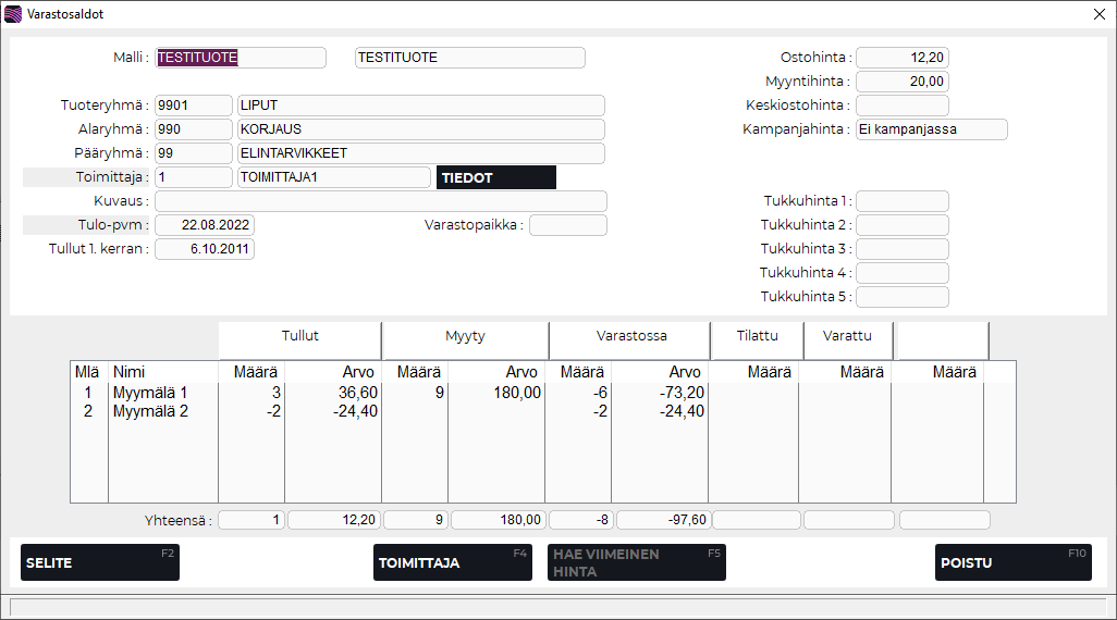 F3 Tuote | Avaa tuotetiedot ko. tuotteen kohdalta. Vastaava toiminto on tuotetiedon oikealla puolella oleva Tiedot painike. Toiminto ei ole käytössä, mikäli koko- ja värilajitelmat ovat käytössä. |