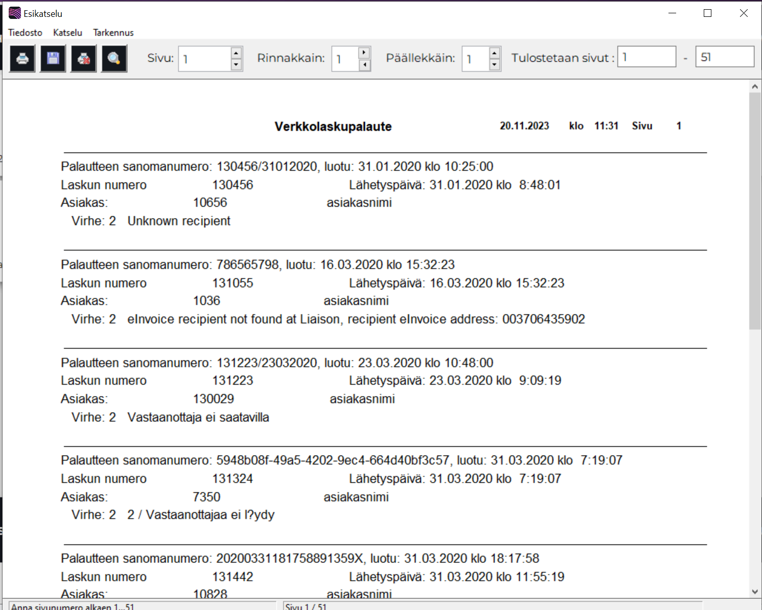 Verkkolaskupalaute-raportissa näet Finvoice-laskujen palautteen.