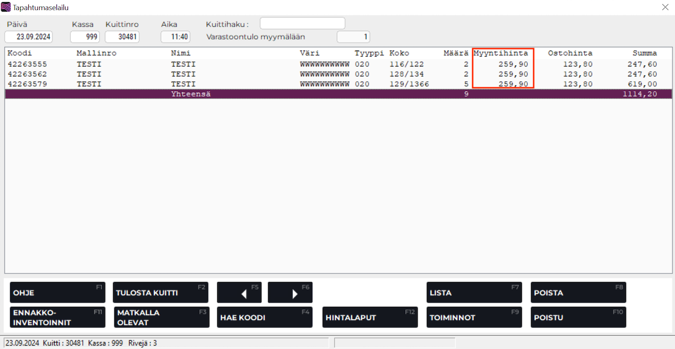 Tapahtumaselailu-ruudulta puuttui Myyntihinta-sarake, joka on nyt lisätty näkymään.