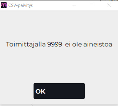 Mikäli F2 Hinnasto tai CSV-päivitys -toiminto käynnistetään ennen kuin siirrettävää aineistoa on tallennettu siirtohakemistoon, ohjelma antaa alla olevan virheilmoituksen puuttuvasta aineistosta,