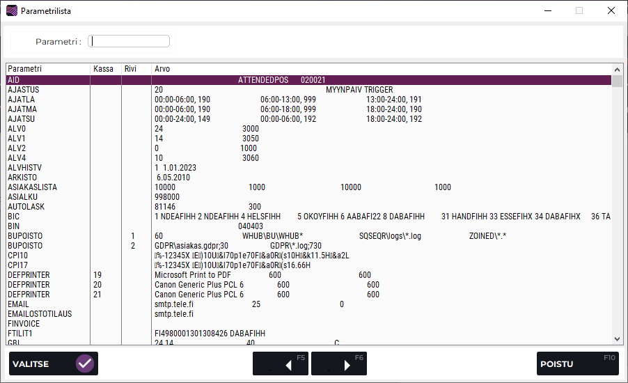 Paina Yleisparametrit-ruudulla F7 Lista -painiketta nähdäksesi listauksen kaikista määritellyistä yleisparametreista.