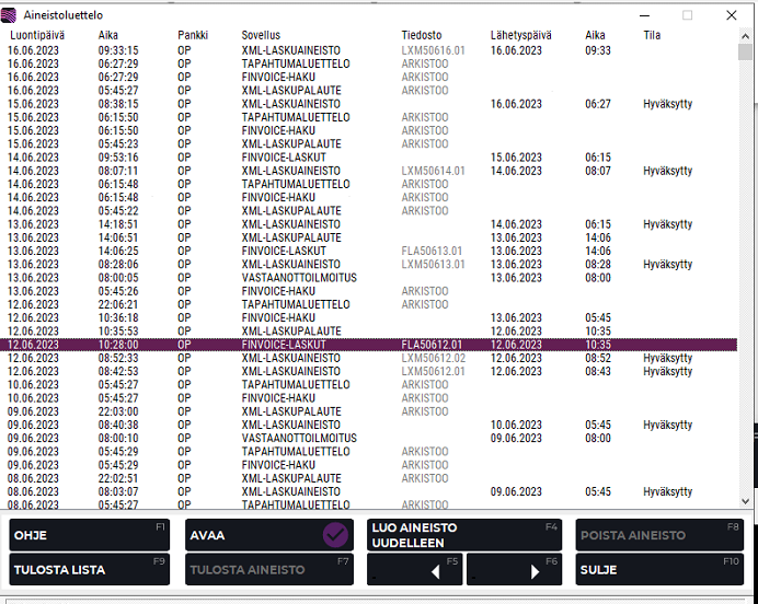 Valitse Tekson valikosta Pankkiohjelma → Raportit → Aineistoluettelo. Finvoice-laskut näkyvät listalla FLA-aineistoina.