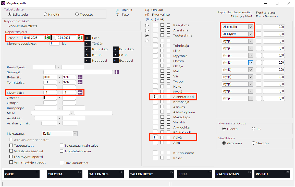 Esimerkki raporttirajauksesta, jolla raportille tulostuvat 10.01.2025 annettujen ja käytettyjen alennuskoodien lukumäärät myymälän 1 osalta.