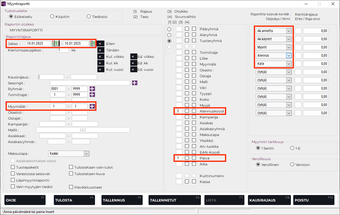 Esimerkki raporttirajauksesta, jolla raportille tulostuvat 10.01.2025 annettujen ja käytettyjen alennuskoodien lukumäärät sekä myynti-, alennus-, ja katetiedot myymälän 1 osalta.