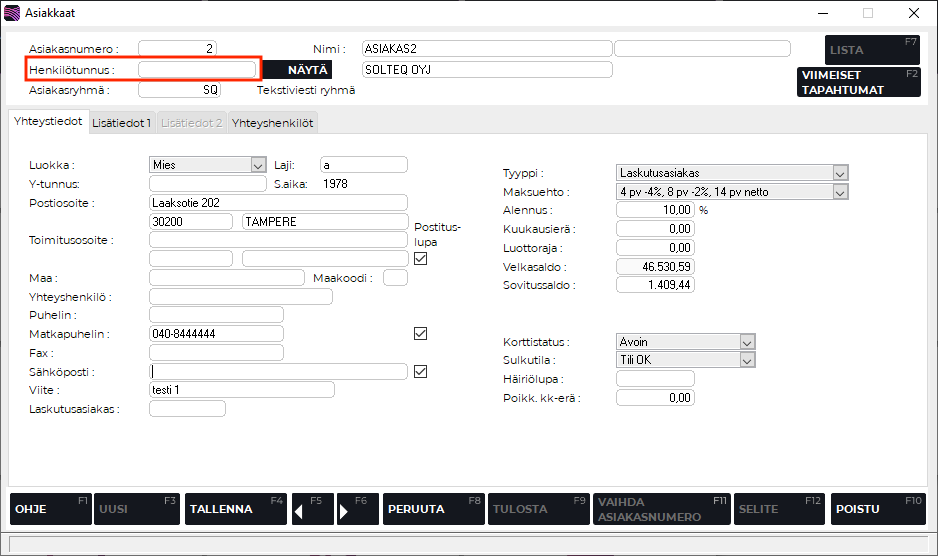 Asiakkaan henkilötunnuskenttä asiakastiedoissa