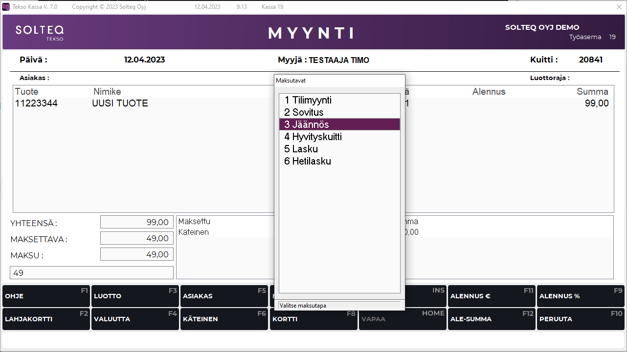 8. Valitse F7 Muu maksu.