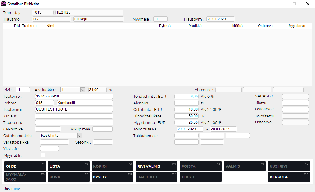 Kun olet syöttänyt tarvittavat tiedot, jatka hyväksymällä rivi painamalla F4 Rivi valmis.