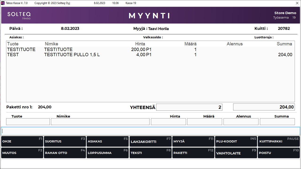 Käytä F12 Paketti -myyntitoimintoa kun haluat myydä tietyn määrän tuotteita yhteishintaan. Pakettimyyntikuittiin tulostuvat paketin tuotteiden SH-hinnat, sekä tehdyn paketin pakettihinta.