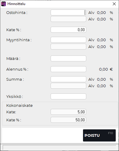 Rivi voidaan hinnoitella Hinnoittelu-ruudun avulla, joka saat auki riviä käsiteltäessä painamalla F12 Hinnoittelu. Kokonaiskate-kohdasta näet koko laskun kokonaiskatteen euroina ja prosentteina.