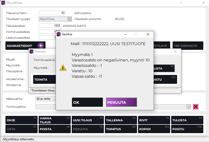 Mikäli Huomautus ylimyynnistä -toiminto on otettu käyttöön, kassaohjelma antaa varoituksen kun myyntitilauksella yritetään toimittaa mallia/tuotetta, jota ei ole varastossa riittävää määrää.