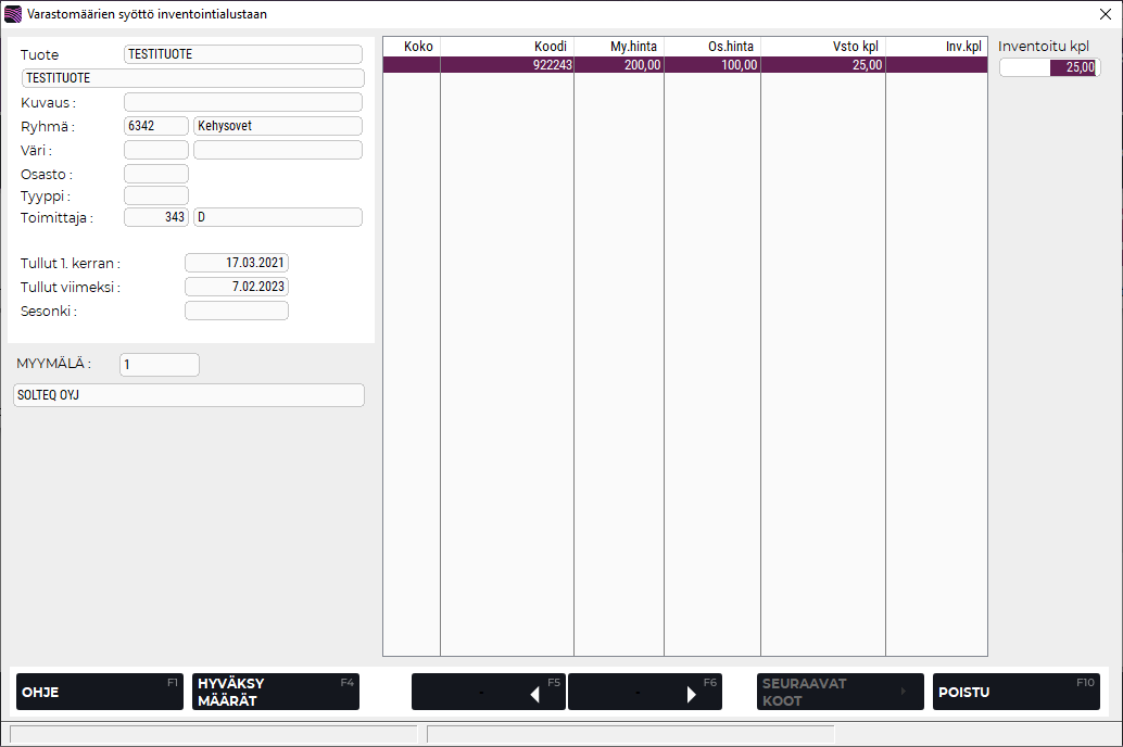 Valintaa Varasto päivitetään heti ei käytetä tässä kuvattua inventointia tehdessä, eli kyseinen kenttä jätetään tyhjäksi. Tämä toiminto on tarkoitettu käytettäväksi ainoastaan normaalin inventaarin ulkopuolella, mikäli halutaan korjata yksittäisen tuotteen saldoa. Sille kuukaudelle, jolle on asetettu normaalin inventoinnin kohdistuspäivä ei saa syöttää inventointia Varasto päivitetään heti-valinnalla. Heti-inventoinnista on erillinen ohje. Ota tarvittaessa yhteyttä Solteqin asiakastukeen.