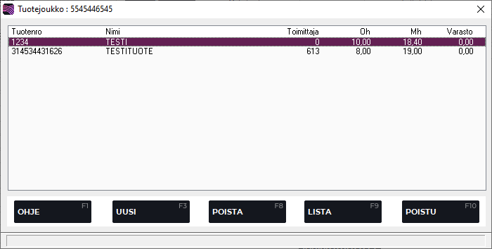Valitse Joukkotuotteet-listalta käsittelyyn haluttu joukkotuote. Avautuvalla Tuotejoukko-ruudulla voit muuttaa kyseisen joukkotuotteen sisältöä. Voit lisätä joukolle uuden tuotteen painamalla F3 Uusi, tai poistaa tuotteen joukosta painamalla F8 Poista.