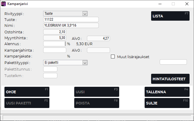 F8 Poista | Poistaa kyseisen rivin kampanjasta tai hinnastosta. |