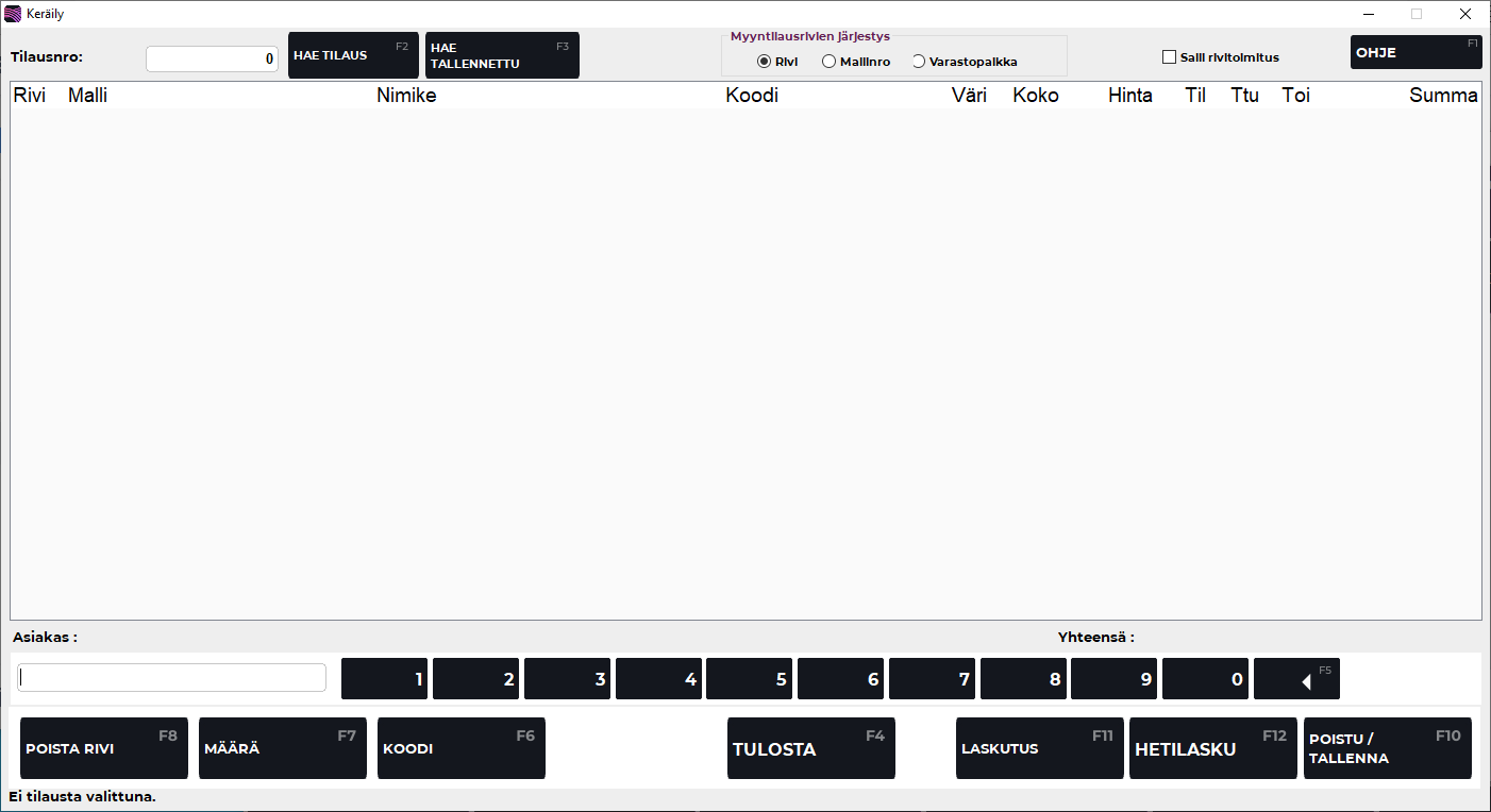 Voit myös poistua tallentamatta keräilyä painamalla Keräilyn keskeytys -ruudulla F10 Poistu; tällöin keräilyssä tehdyt muutokset perutaan. Muutokset on mahdollista perua niin kauan kun keräilyä ei ole laskutettu; esimerkiksi kun keräily on haettu tallennetuista ja poistuttu tallentamatta, voidaan tilaus hakea taas alkuperäisin tiedoin tilauksista.