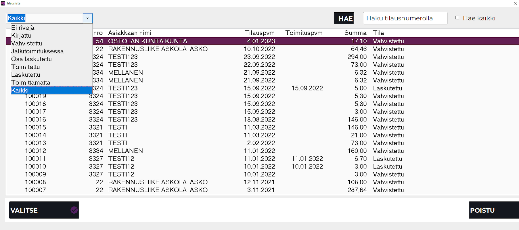 Jos myyntitilaukselle jäisi toimittamattomia kappaleita, ohjelma kysyy toimituksen yhteydessä kirjataanko tilaus kokonaan toimitetuksi.