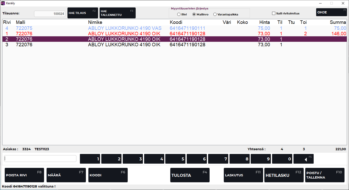 Punainen rivi: keräilyvaiheessa rivi muuttuu punaiseksi, kun toimitettu määrä on isompi kuin tilattu määrä. Uusi rivi (keräilyyn lisätty koodi, jolle ei ole tilattua määrää) näkyy myös punaisena.