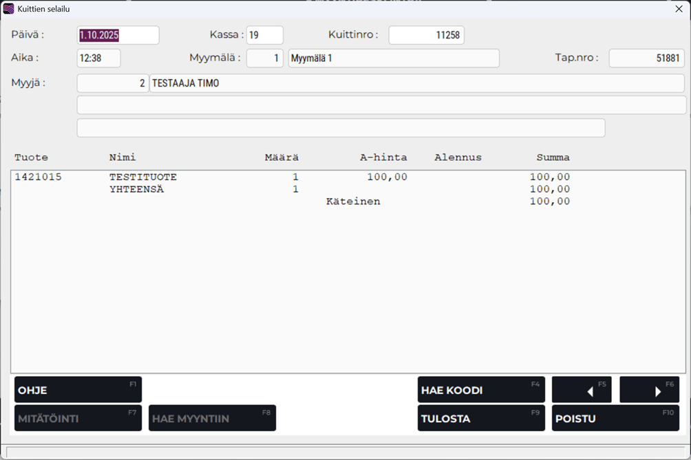 Kuittinumero | Kuittinumero, jota halutaan tarkastella; voit myös syöttää numeron. Mikäli et tiedä kuitin numeroa, niin voit selata kaikkia kuitteja F5- ja F6-näppäimillä. |