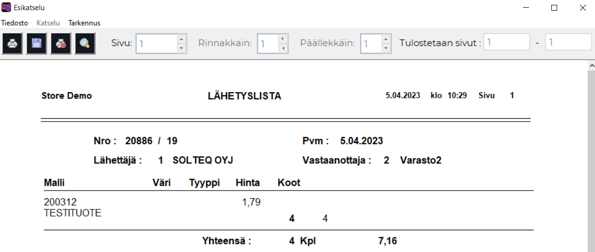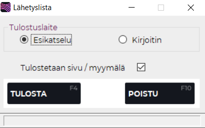 Lähetyslista muodostetaan varastosiirron pohjalta. Lähetyslista-ruudulla voit tulostaa lähetyslistaluettelon esikatseluun tai kirjoittimelle.