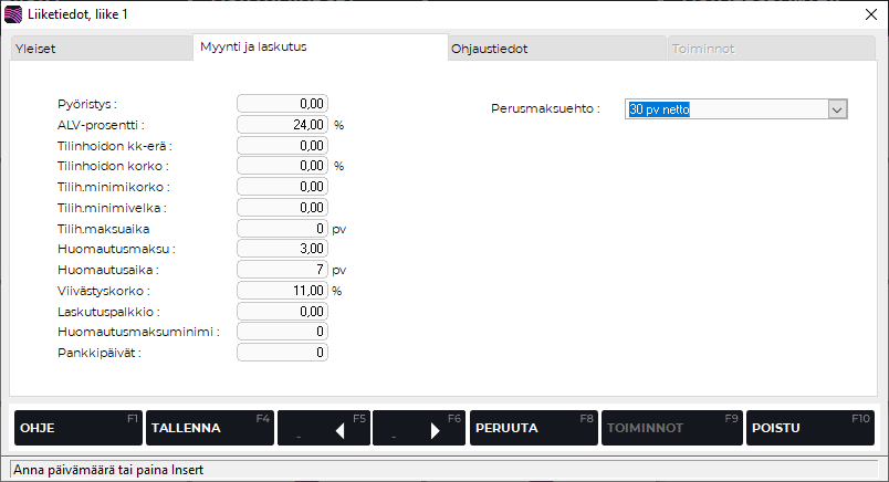 Perusmaksuehto | Viivästyskorko ja huomautusaika ovat laskutusta varten. |