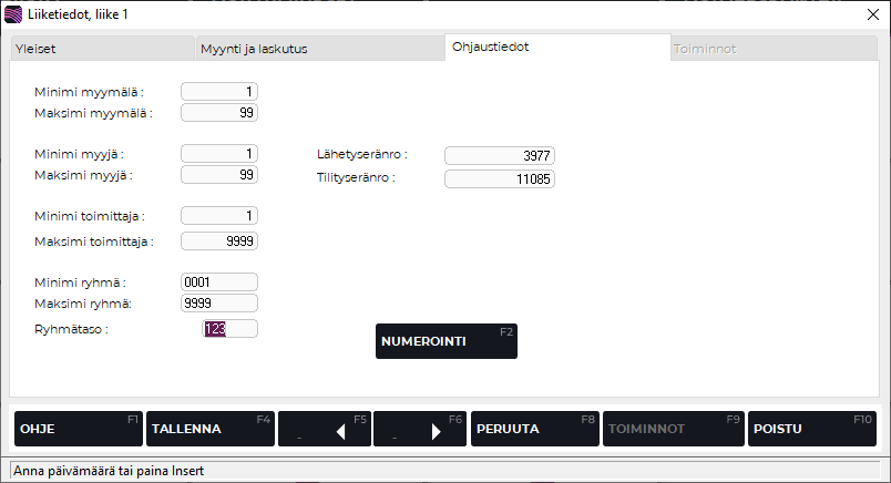 Liikkeen nimi ja tilinumero | Näiden väliset tiedot yleensä annetaan. Tiedot tulostuvat laskutuksen yhteydessä laskulomakkeelle. Myös jotkut raportit käyttävät näitä tietoja. |