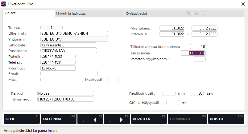 Liikkeen perustietoihin annetaan tietoja raportteja, laskutusta, ja muita vastaavia toimintoja varten. Tiedot määritellään Solteqin toimesta asennuksen yhteydessä.