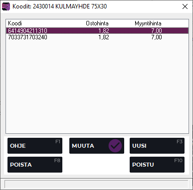 Mikäli tuotenumerolla on useampia koodeja, voit lisätä ne lisätä painamalla Tuotteet-ruudulla Lisäkoodit-painiketta. Painikkeesta aukeaa ruutu, jossa voot lisätä, muuttaa ja poistaa koodeja. Lisäkoodeilla voi olla eri osto- myyntihintoja.