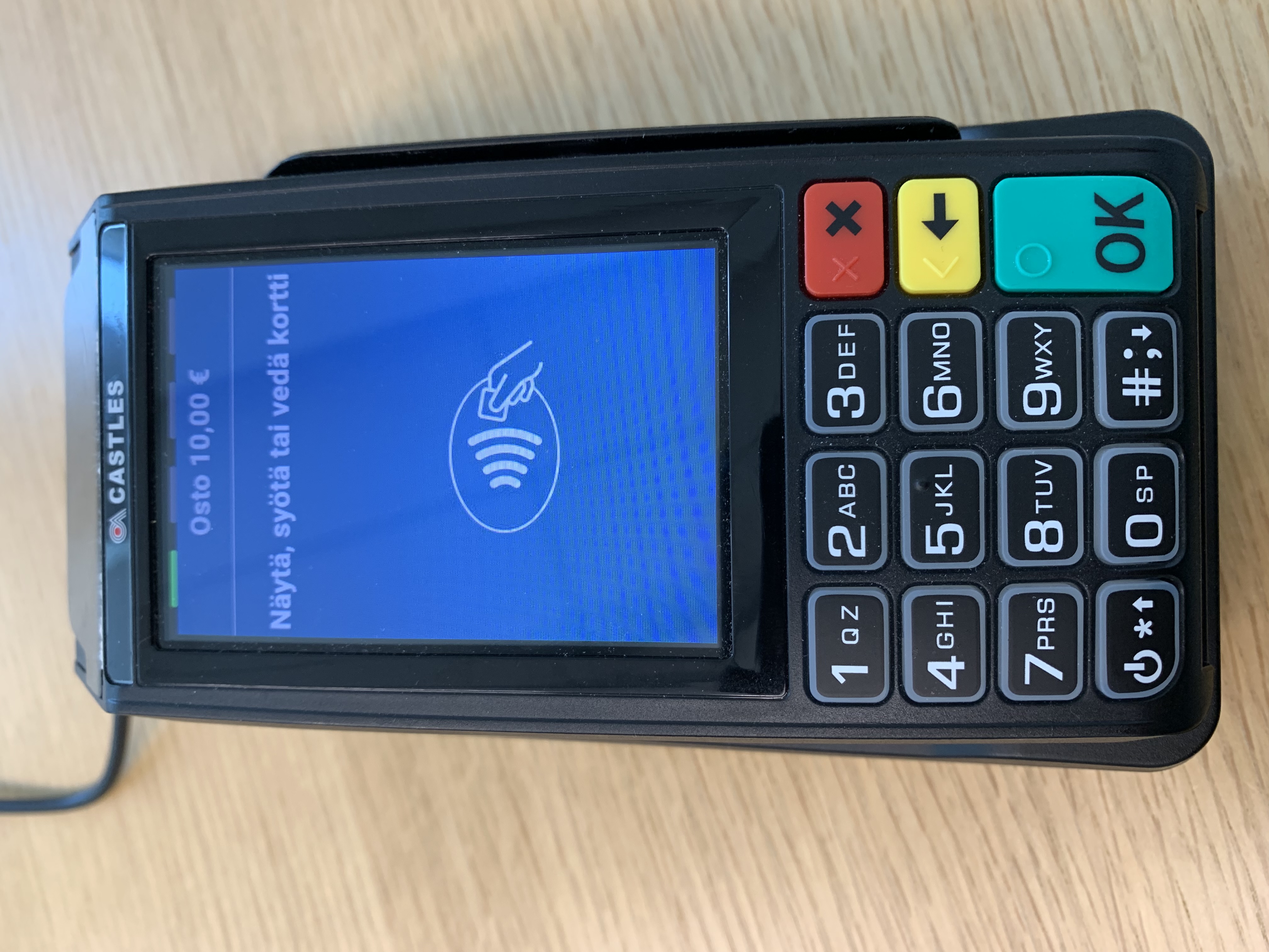 Odottaa korttimaksua -teksti maksupäätteessä
