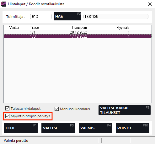 Klikkaa Hintalaput / Koodit ostotilauksista -ruudulla Myyntihintojen päivitys -valintaruutu aktiiviseksi.